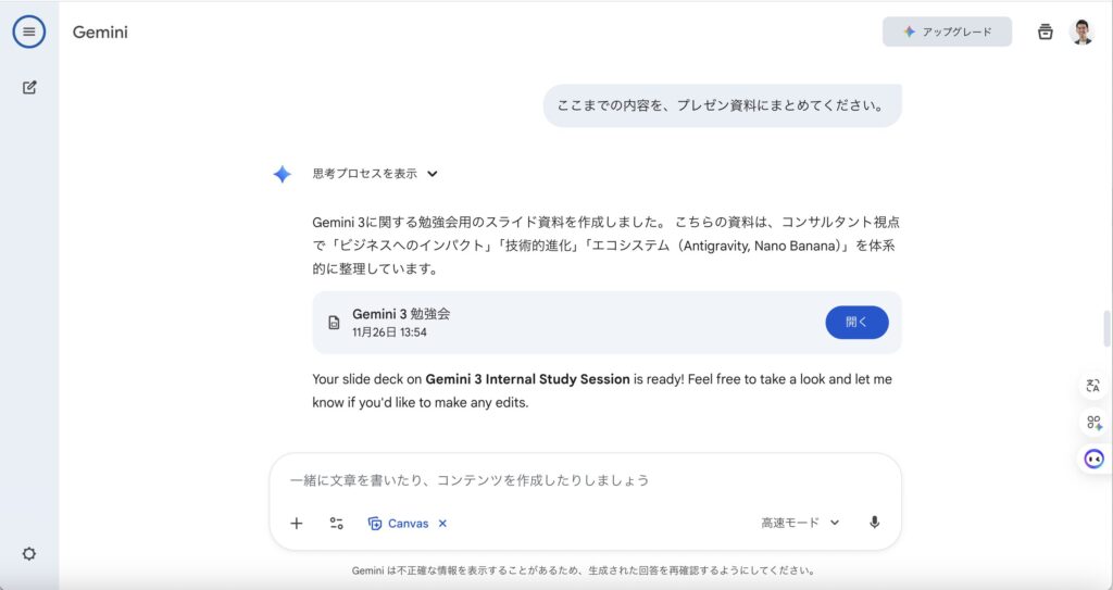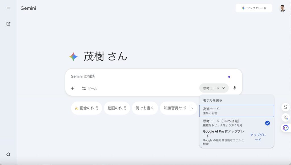 また、Gemini 3を使用する際には、複雑な推論を行う「思考モード」と素早く回答を生成する「高速モード」を選択して切り替える必要があります。ChatGPTが5になって、このエンジン切替をプロンプトを読み取って自動で行ってくれるようになったことで、この切替は少々煩わしいと感じる側面もあります。そういう意味では、とにかくカンタンに操作したい方にとってはChatGPTは良い選択肢かもしれません。