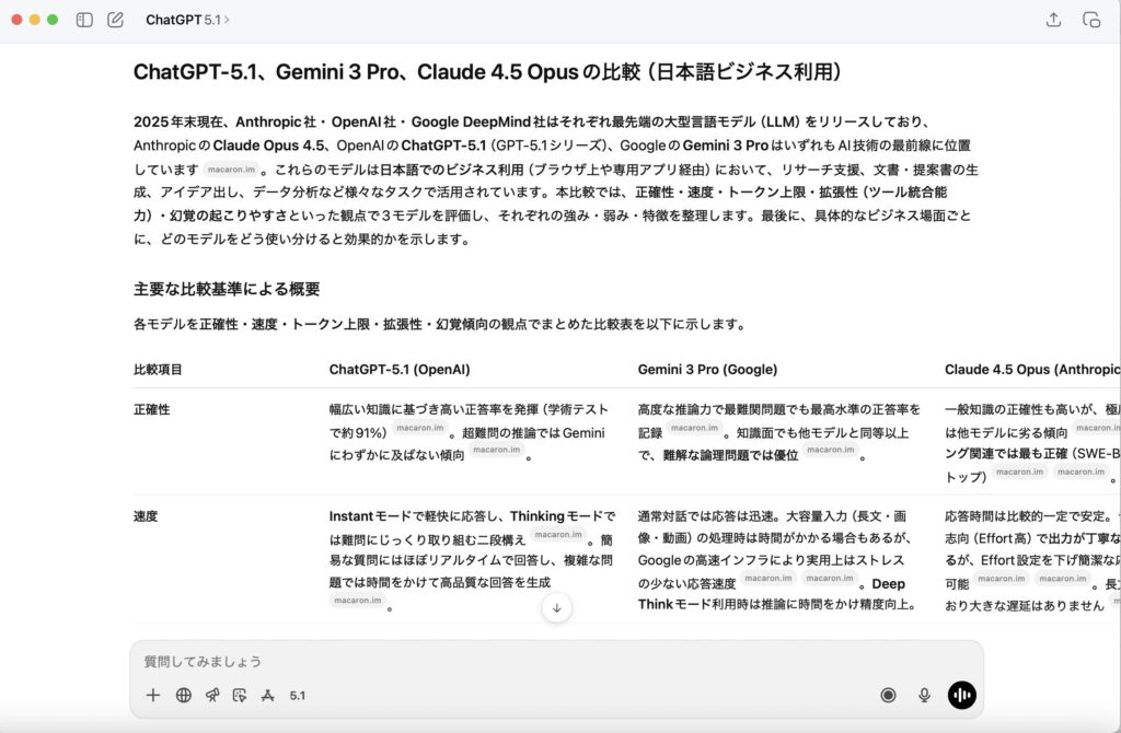 「なんだ!またやり直しか!」と思いました。結局のところ、ずっとイタチごっこが続いていて、「最新モデルがすごい」と言ったその数日、数週間後には、また別のモデルが登場して塗り替えられる、、、といったことの繰り返しが、この2年ぐらいずっと続いているわけです。ChatGPTも地味に5.1にバージョンアップしていて、「結局のところ、どれを使ったら良いのか?」という話になるわけです。