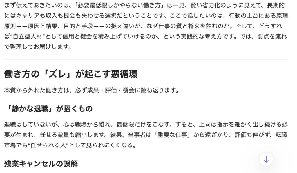 まずGeminiで試してみたところ、2,462文字の原稿が生成されました。目を通してみたところ、かなり要約しすぎていて、私が動画で伝えたかったことが所々抜け落ちている上、私が話した覚えのないことも文章に含まれていました。