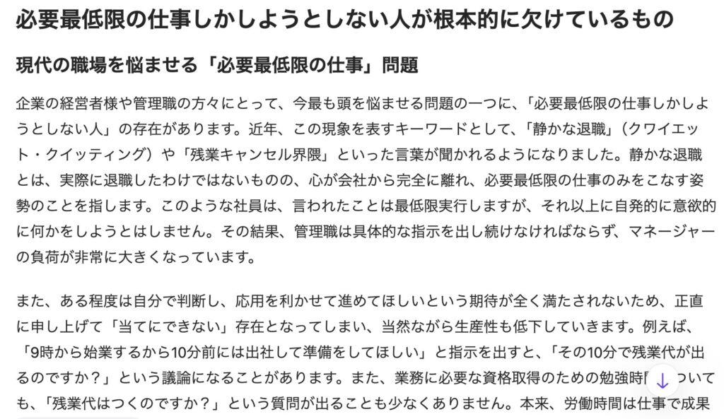 ChatGPTの出来は最も悪く、生成された文章はわずか1,871文字でした。一段落あたりの文章がとても短く、淡白で、読み物としてあまり面白いとは思えないようなものが出来上がりました。やはりChatGPTは「省エネ」で動く模様で、こうした長文生成には向かないことが確認できます。