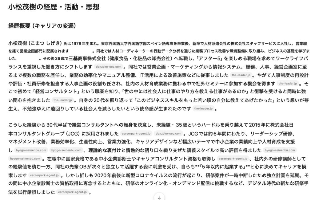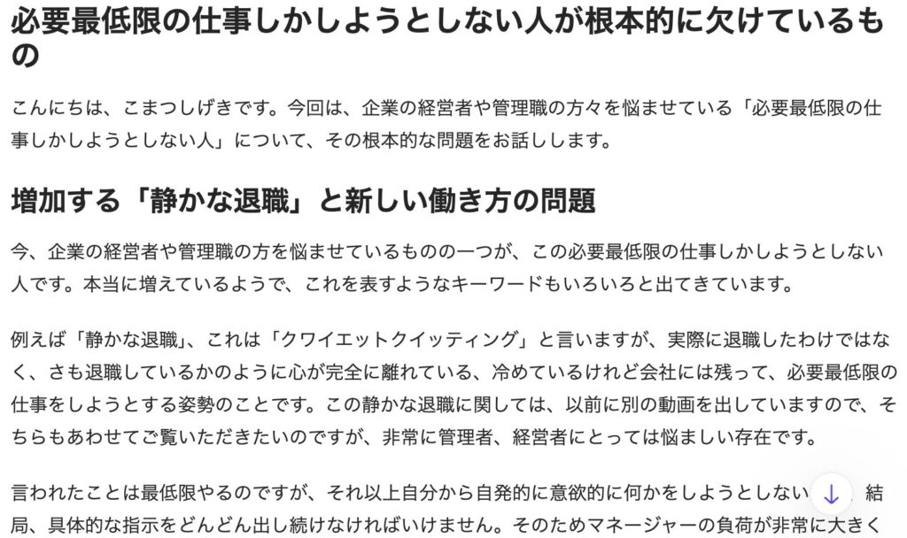 そして、最後にClaudeで検証。なんと7.962文字の原稿が生成されました。そして、それ以上に嬉しいのが、変に要約したりせず、元動画の内容をかなり忠実に読みやすい文章に書き換えています。冒頭の「こんにちは。小松茂樹です。」から始まり、ほぼ話している通りに文章にしてくれているのです。これで確信です。私の中では「数千文字の長文を書かせるならClaude一択」です。