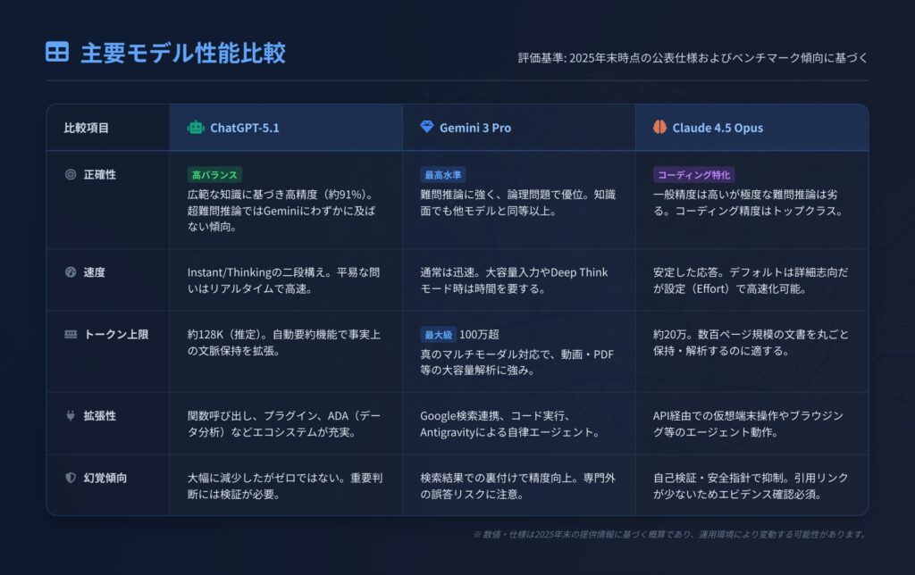 です。とはいえ、いずれも優れたモデルですし、日本語の文体なども含めてそれぞれに個性があります。よほど専門的な使い方をしない限り、性能差を露骨に感じるほどではないので、結局のところは「好み」で構わないと思います。自分が好きなAIを選んで使っていきましょう。