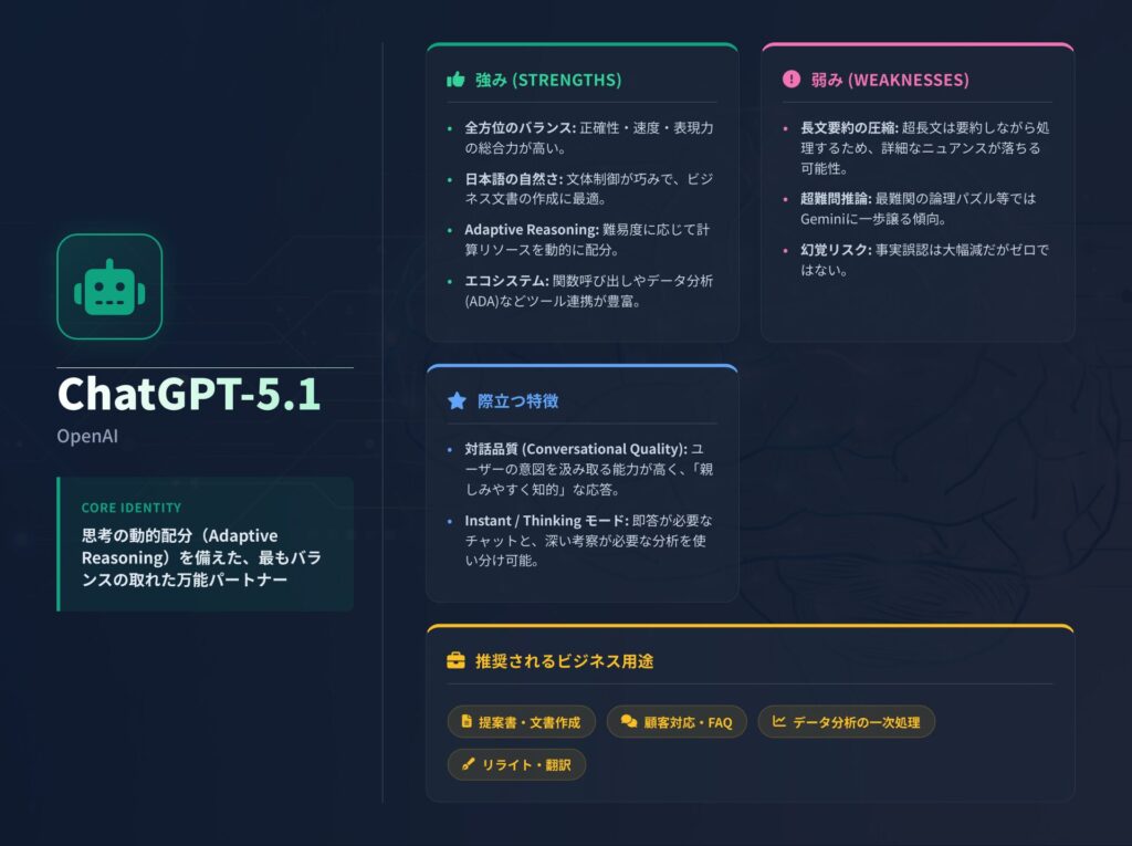 「日本語が自然である」と称されることもあるのですが、個人的にChatGPTの日本語文章はあまり良いとは思えない面もあります。とはいえ、これは好みの問題です。私個人としてはGeminiの文体が好みなのですが、いろいろなモデルを試しながら、自分に合ったものを選択されると良いと思います。