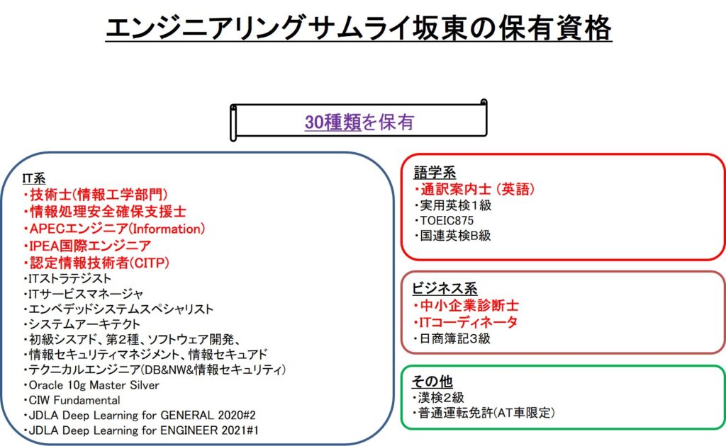 筆者のキャリアは、まさに挑戦の連続です。技術士(情報工学部門)をはじめ、情報処理安全確保支援士、認定情報技術者(CITP)、中小企業診断士、ITコーディネータ、さらには通訳案内士(英語)など、IT・ビジネス・語学の三領域にわたって資格を取得。