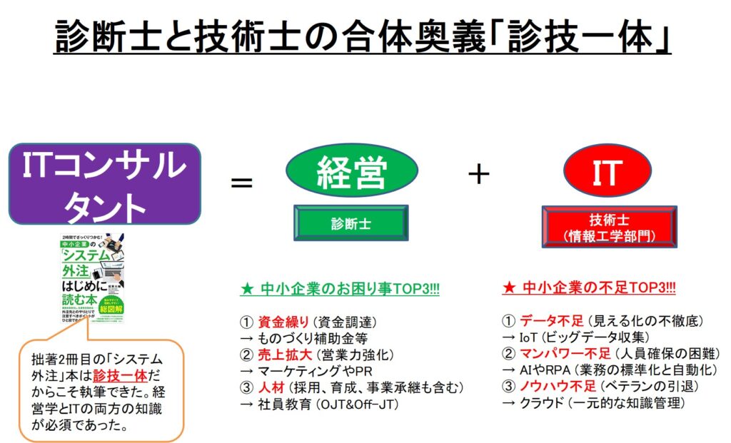 特に、ITコンサルタントを生業とする筆者にとっては、国家資格である中小企業診断士と技術士の組合せの相性は抜群に良いです。診断士の「経営学」と技術士の「情報工学」が両輪の柱となっており、片方のみでは成立しないのがITコンサルタントの仕事だからです。まさにITコンサルタントの本質は「診技一体」にあるのです。
