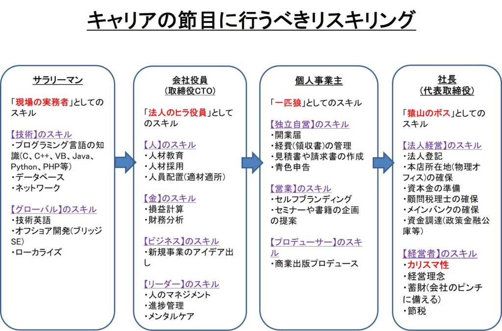 筆者の人生を振り返ると、「サラリーマン→会社役員(取締役CTO)→個人事業主→社長(代表取締役)」と、節目ごとにリスキリングを実践してきました。立場が変われば求められるスキルも変化する。だからこそ、その都度“自分のOSをアップデート”する必要があるのです。