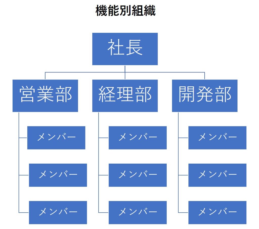 機能別組織は、営業、製造、開発、人事、経理など、機能ごとに部門を分ける最も基本的な組織形態です。皆さんの働いているもしくは知っている会社も、この形態をとっているところが多いのではないでしょうか。