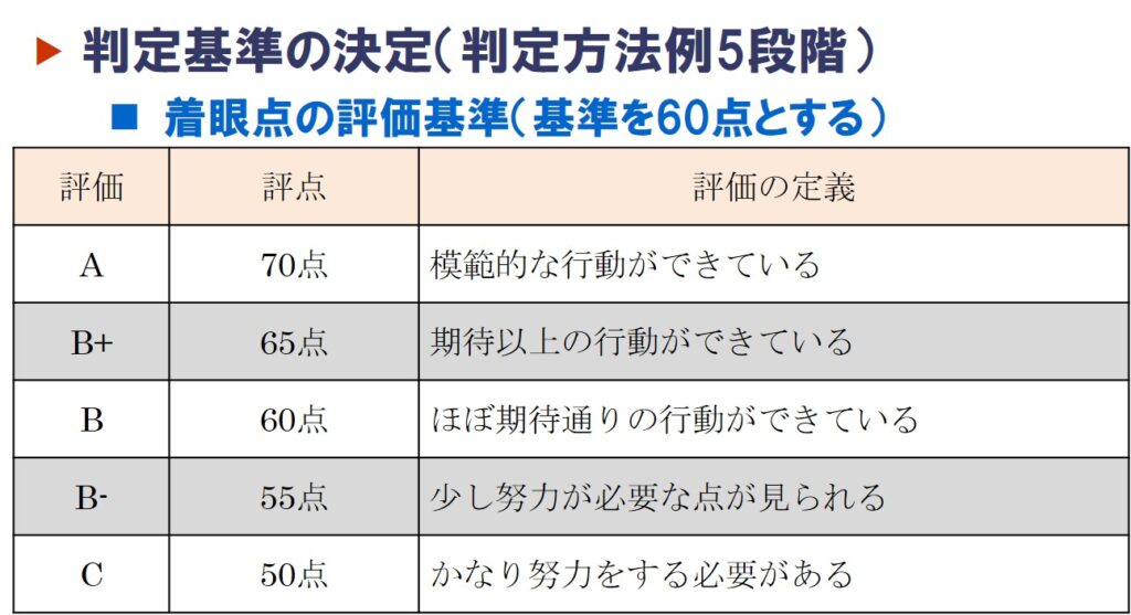 総合判定について、私は60点を基準として点数化しておりますが、この点数は被評価者に見せないようにしています。というのも、同じB評価で「60点」と「59点」の差はなぜか?という問いに対して回答できないからです。たまたま評価点を合わせると1点差がついただけで、その差が具体的に何かを説明することは難しいため、英語表記の評価でフィードバックしてもらっています。「B」と「B+」の差であれば、フィードバック時に説明ができるかと思います。