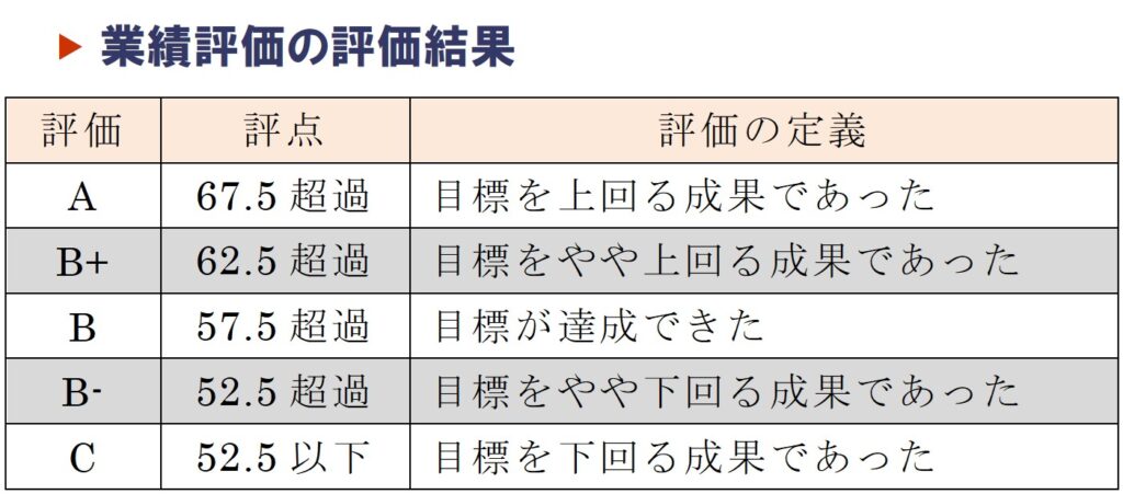 業績評価についても同じく、60点を基準として判定してもらっています。