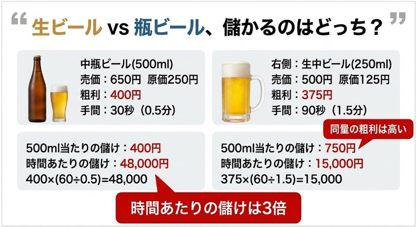 セミナーでよくお話しする、「生ビールと瓶ビール、どちらが儲かるか?」という問いがあります。 原価率だけで見れば生ビールの方が優秀なことが多いでしょう。しかし、生ビールはサーバーのメンテナンスや、注文のたびにジョッキに注ぐという時間(人件費)がかかります。 一方、瓶ビールは冷蔵庫から出して栓を抜くだけです。提供スピードが圧倒的に速く、スタッフの労働時間を奪いません。