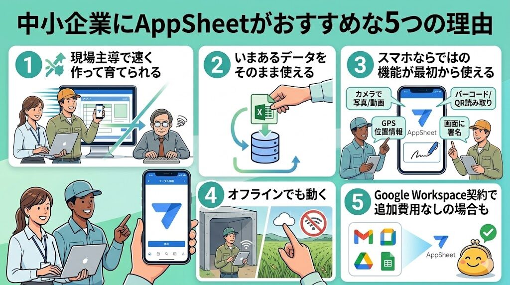 AppSheetが中小企業のDXで使われやすいのは、現場の制約に合っているからです。