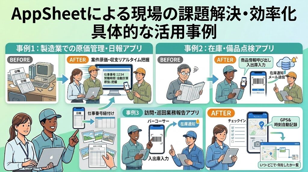 AppSheetで効率化できる業務は幅広いですが、ここでは一部の例を紹介します。